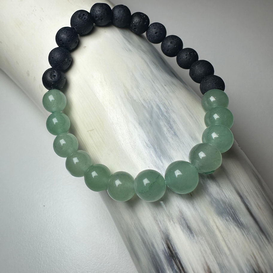 Das frische Grün des Aventurins trifft auf die erdige Struktur der Lava – eine harmonische Verbindung aus Ruhe, Stärke und natürlicher Ausstrahlung.