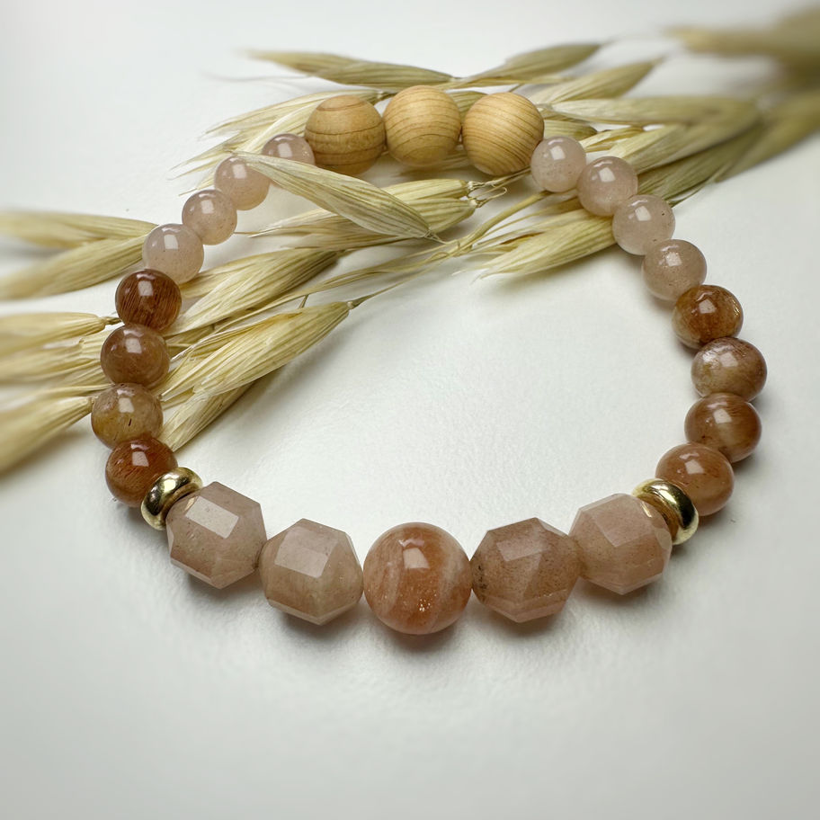 Dieses handgefertigte Diffusor-Armband vereint verschiedene Sonnenstein-Perlen mit naturbelassenen Holzperlen und vergoldeten Silberlinsen. Die warmen, goldenen Farbtöne wirken aufhellend und lebendig – ein Armband, das Leichtigkeit, Zuversicht und innere Stärke in den Alltag bringt.